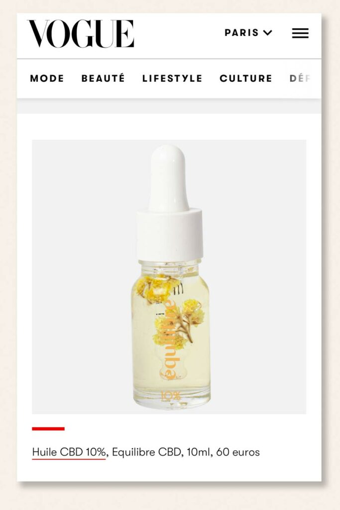 Flacon avec pipette gradué d'huile de CBD Equilibre 10% et fleurs immortelles dans l'article de presse de Marie Claire